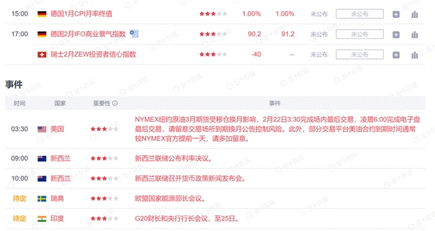 周二,因强劲的经济数据引发交易员们对美联储的鹰派加息预期升温,现货黄金回吐日内大部分涨幅,未能站上1840美元上方,最终收跌0.37%,报1835.34美元/盎司。现货白银收涨0.12%,报21.85美元/盎司。美元指数围绕104关口来回震荡,最终收涨0.31%,报104.19。因最新数据使交易员们对美联储保持谨慎,2年和10年期美债收益率都达到了去年11月以来的最高水平,10年期美债收益率最高涨至3.962%。原油方面,两油日内走势纠结。WTI原油在美盘前涨至77.60美元的日高后回吐所有涨幅并转跌,最终收跌1.45%,报76.16美元/桶;布伦特原油收跌1.35%,报82.53美元/桶。天然气方面,美国天然气期货日内重挫超9.00%。