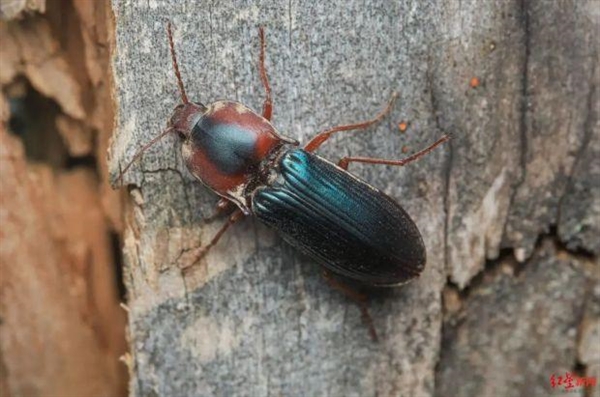 “甲虫呈现金属蓝色光泽,在其前胸背板的两侧,都有红色斑纹,长得特别好看,初判是一个金叩甲的物种。”